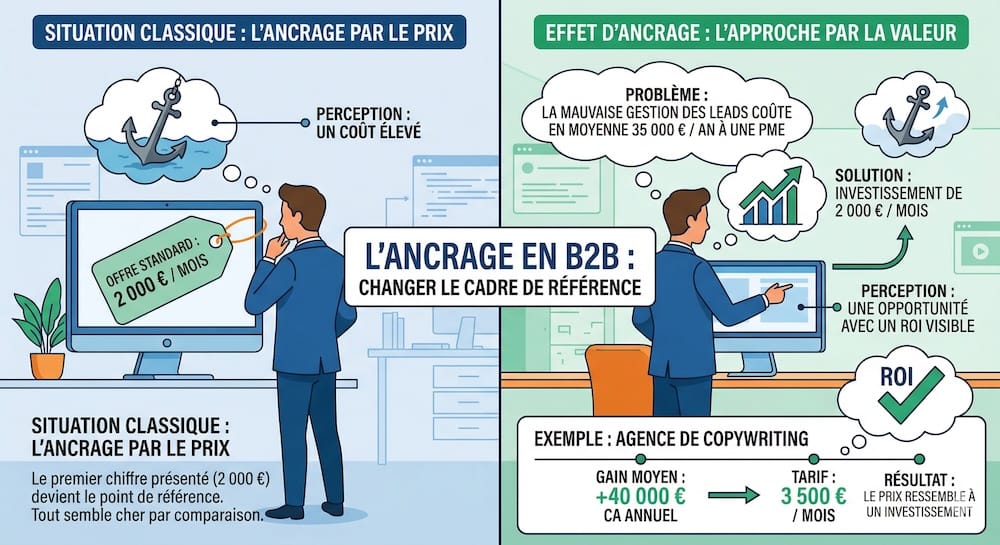 En B2B, ça se traduit directement sur tes pages tarifaires. Si tu présentes ton offre à 2 000 € par mois en premier, c'est ce chiffre qui ancre la perception. Si tu montres d'abord le coût du problème que tu résous (ex : "une mauvaise gestion des leads coûte en moyenne 35 000 € par an à une PME de 10 personnes"), alors 2 000 € par mois devient une évidence.
